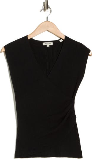 Wrap styling creates a figure-skimming silhouette in this surplice V-neck sweater framed by cap sleeves.