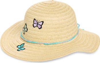 This straw floppy hat features bright embroidered butterflies and a braided back-tie band for a breezy, sun-shading staple your kiddo will love.