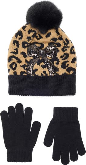 They'll stay cozy in fierce style by topping off their cold-weather look with this cheetah-knit pompom beanie adorned with a sequin bow accent and paired with coordinating gloves.