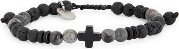 A beautiful cross acts as the centerpiece on a faith-themed bracelet strung with labradorite and lava stone beads said to represent balance and strength.