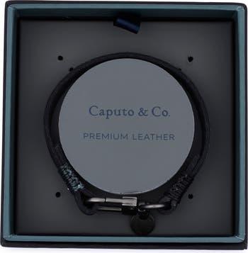 Wrapped cords frame this striped leather bracelet secured by a swiveling carabiner clasp for contemporary style.