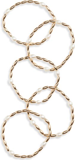 Glam up your wrist stack with a matching set of stretch bracelets glinting with goldtone plate and shimmery faux pearls.