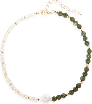 One side crystals, one side stone beads—this collar necklace that comes together with a lustrous faux pearl eminates natural beauty.