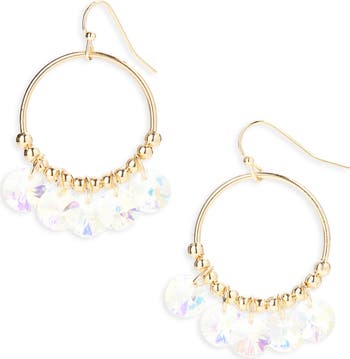 Polished beads and colorful crystals detail the ends of these hoop earrings plated in warm goldtone.