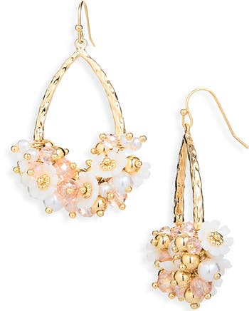 Bring botanical shine to your lobes with these sleek open-drop earrings showcasing a cluster of beaded flowers and faux pearls.