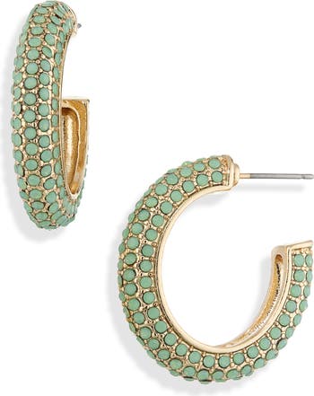 Glam up your look with these domed hoop earrings illuminated by shimmery pavé rhinestones.