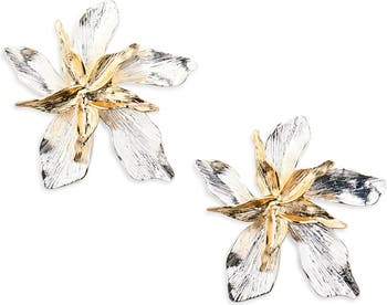 Show off striking shine with whimsical floral stud earrings boasting a glossy two-tone finish.
