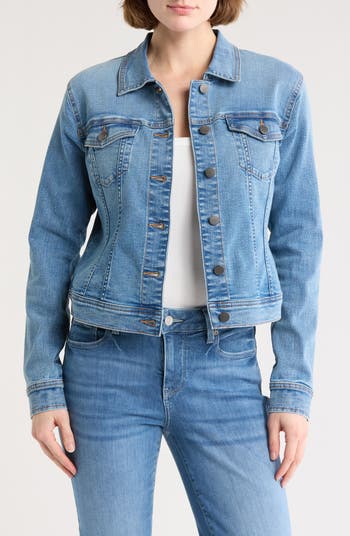 Layer on this trendy jacket constructed from comfortable stretch-cotton denim for casual style.