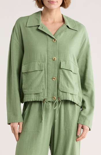 Layer on this lightweight linen-blend jacket constructed with roomy pockets and a sporty drawcord-toggle hem.