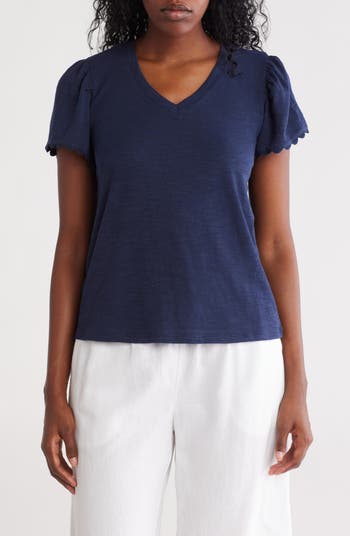 Scalloped edges along the sleeves make a sweet yet subtle statement against this cotton-blend T-shirt built for all-day comfort.