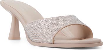A softly squared toe and minimalist profile define a versatile slide sandal set on a svelte flare heel and cushioned by B.E.D Foam Comfort Technology.