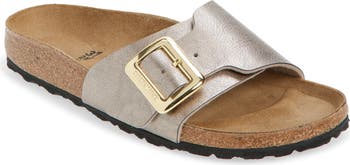 A gleaming buckle cinches the angled bridge strap of a sandal built on the legendary Birkenstock footbed for time-tested comfort and on-trend style. The EVA-cushioned footbed absorbs shock and mimics the shape of a healthy foot, while pronounced medial and metatarsal arches support the instep and ball of your foot.
