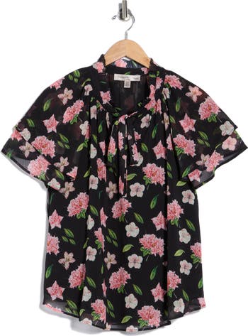 A pretty pattern of blooms lend a pop of color to a woven top framed by a tied neckline and fluttery sleeves.