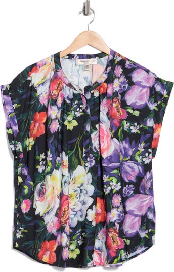 A vibrant garden of blooms bring enchantment to a woven top framed by dolman sleeves and a slim collar.