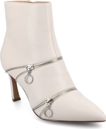 A duo of zippers wraps around the vamp of this sleek ankle boot styled with a pointed toe and lofted with a flared slim heel.