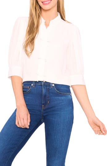 Dainty decorative bows finish the front of this lightweight georgette top framed by voluminous puff sleeves.