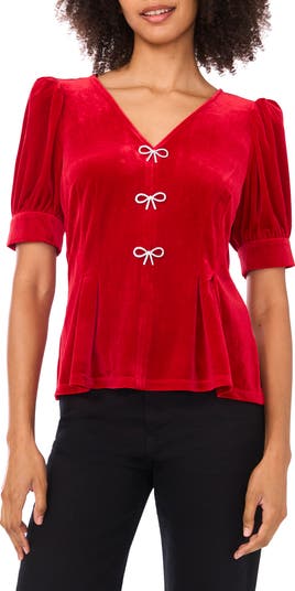 A trio of embellished bow hardware channels the coquettish aesthetic at the front of a V-neck top cut from soft velvet sure to charm any audience.