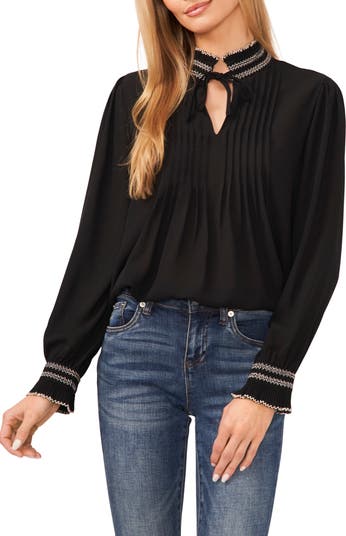 Pintucks on the bodice add to the charm of this crepe popover shirt accented with touches of frill and contrast-stitch embroidery. and