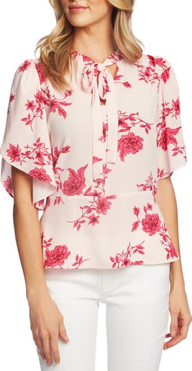 Pretty blossoms and cascading tulip sleeves add to the romance of a demure tie-neck blouse in a peplum cut of textured crepe.