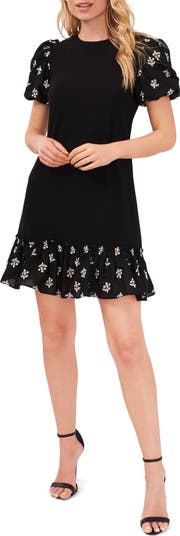 Pretty floral embroidery adorns the puff sleeves and flouncy ruffle hem of this fabulous dress cut from a stretch-crepe fabric.