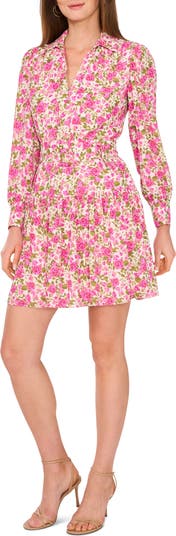 A pearly zipper pull enhances the polished appeal of a pretty floral dress fashioned with a Johnny collar, belted waist and romantically flounced hem.