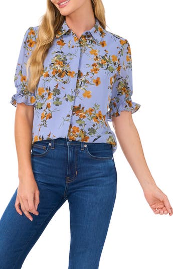 Sheer puffed sleeves with smocked cuffs charmingly frame this gauzy georgette button-up topped with a spread collar.
