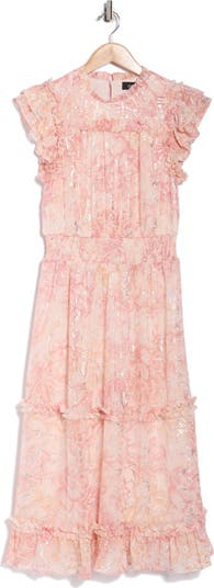 Metallic blooms and fanciful frills elevate this flowy tiered dress perfect for your next weekend event.