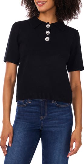 A trio of jewel-encrusted buttons add to the preppy vibe of this short-sleeve polo knit from soft, stretchy yarn in a roomy fit.