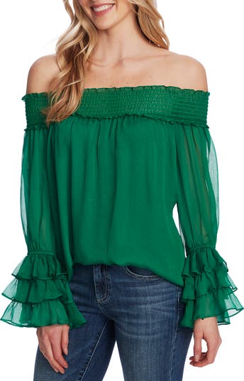 Serve up laid-back loveliness in a romantically ruffled chiffon blouse styled off the shoulder.
