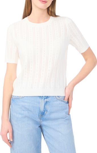 This short-sleeve sweater with pointelle stitching is sure to a favorite wardrobe pick when layered with other pieces.