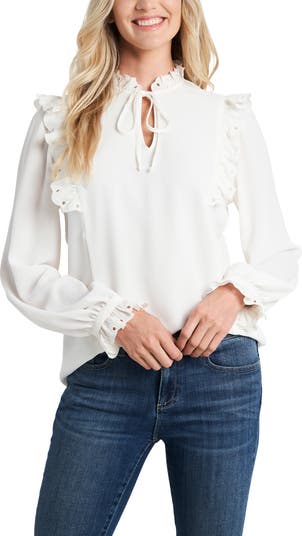 Prairie touches gently detail this sweet blouse that's tied at the neck and embellished with eyelet-edged ruffles.