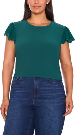 Fluttery scalloped-hem sleeves lend lovely animation to this stretch-kissed top that can easily go from the office to the weekend.