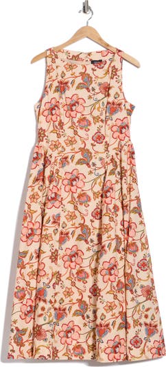 Gathered godets trace the hips to amplify the fit-and-flare silhouette of a romantic sleeveless dress made from light, breathable cotton in a pretty blossom print.