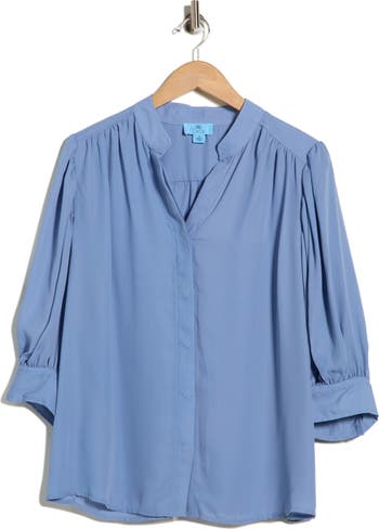 Perfect for the workday or weekend, this lightweight button-up shirt is framed by a split neck and gently puffed three-quarter sleeves for instant charm.