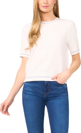 This fine-gauge sweater is knit from soft combed cotton and ringed in contrast for a neat vintage look.