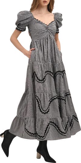 Rickrack trim adds to the charming look of a tiered maxi dress patterned in gingham checks inspired by your favorite picnic cloth.