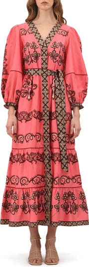 Show off chic boho style in this vibrant cotton-poplin maxi dress framed by billowy balloon sleeves and a removable tie belt.
