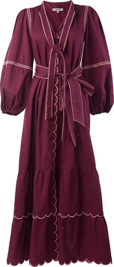High-contrast embroidery, billowing sleeves and dual ties add charming detail to a maxi dress cut from pure, breathable cotton.