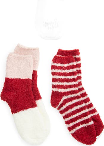 Wrap yourself up in softness and warmth with this two-pack of lounge-ready crew socks made from buttery soft knit presented in a cute stemless wine glass.