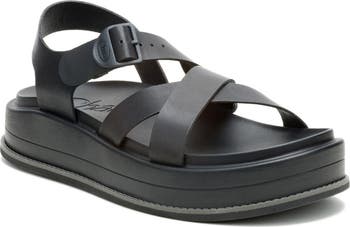 Crisscrossing straps bring modern dimension to this comfort-minded platform sandal featuring an arch-supportive LUVSEAT footbed and a grippy rubber sole.