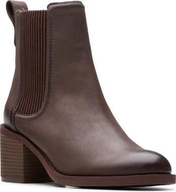 Dual goring insets and a rear pull-tab offer easy wear on a cushioned Chelsea boot balanced by a plain toe and stacked block heel.