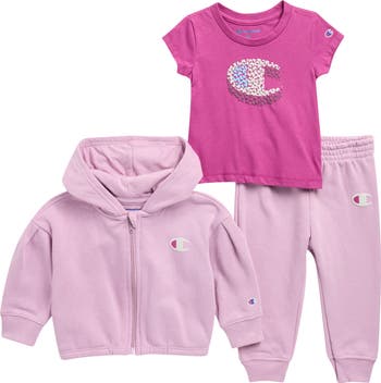 Keep your little one cozy in this sporty three-piece set including a full-zip hoodie, logo printed T-shirt and coordinating pull-on pants.