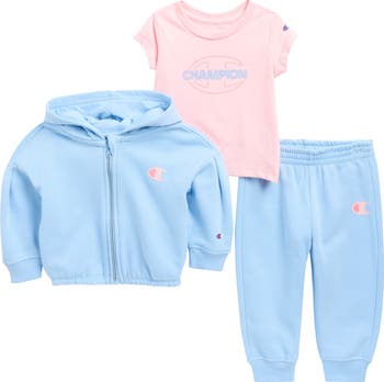 Keep your little one cozy in this sporty three-piece set including a full-zip hoodie, logo printed T-shirt and coordinating pull-on pants.
