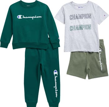 Give your kid sporty style with this coordinated four-piece set including a logo printed sweatshirt, pants, T-shirt and shorts.