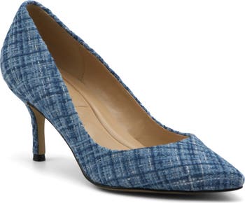 A pointy toe and tapered heel balance a poised pump set on a cushioned footbed and slip-resistant sole.