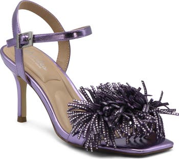 Jewel-encrusted pompoms elevate a soirée-ready sandal framed by a square toe and tapered heel.