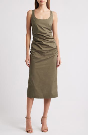 Rippled ruching brings texture and eye-catching appeal to a sleek tank dress crafted from stretch polish for crispness and easy movement.