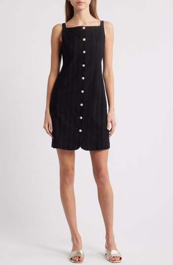 Pearly buttons add a charming style point to an all-cotton dress textured in stripes and perfected with a pair of pockets.
