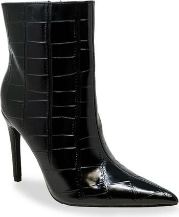 A croc-embossed texture adds a bit of an edge to this stylish faux-leather bootie that's framed by a pointy toe and slender stiletto heel.