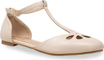 Artful cutouts at the vamp give sweet style points to this ballerina flat updated with a slender T-strap that buckles at the ankle.